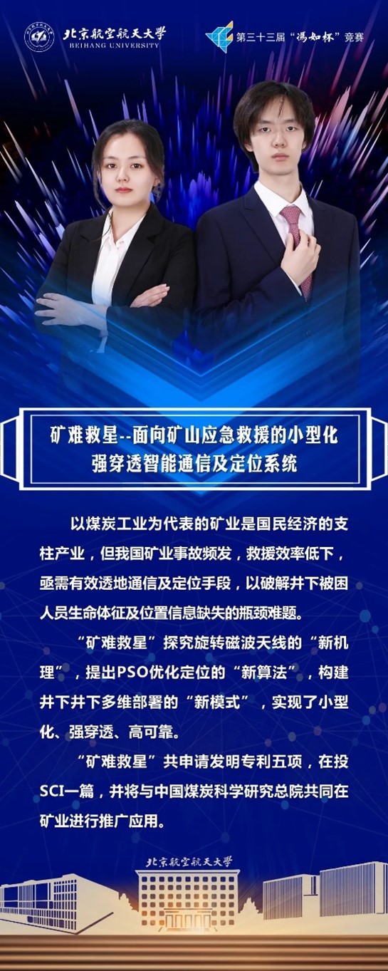项目简介:以煤炭工业为代表的矿业是国民经济的支柱产业,但我国矿业事故频发,救援效率低下,亟需有效透地通信及定位手段,以破解井下被困人员生命体征及位置信息缺失的瓶颈难题。"矿难救星"探究旋转磁波天线的"新机理",提出PSO优化定位的"新算法",构建井下多维部署的"新模式",实现了小型化、强穿透、高可靠。"矿难救星"共申请发明专利3,33届冯如杯主赛道制作组一等奖,与煤炭科学研究总院达成合作意向。