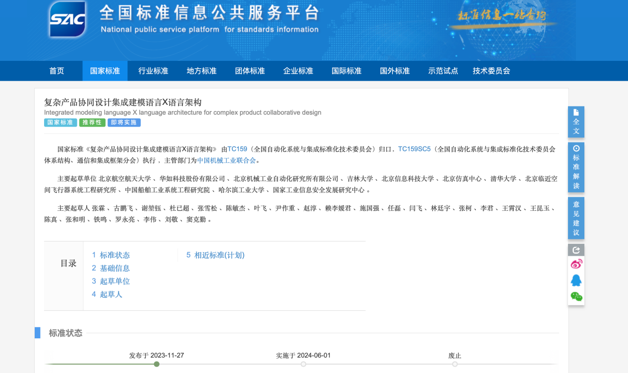 我校自主研发的《复杂产品协同设计集成建模语言X语言架构》国家标准(GB/T 43270-2023),于2023年11月27日正式发布。