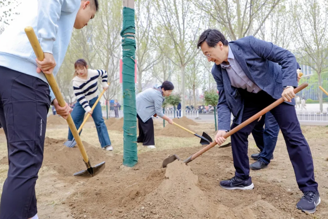 春回大地,草木逢春,植树播绿正当时。4月12日上午,党委书记赵长禄,校长王云鹏,党委副书记、纪委书记何新洲,副校长刘树春,党委副书记程波,副校长吕卫锋,党委副书记杨立军,副校长赵巍胜、吕金虎、邓怡等一行来到沙河校区八号楼东侧绿地,和师生一同开展义务植树活动,共同为沙河校区植树添绿。
