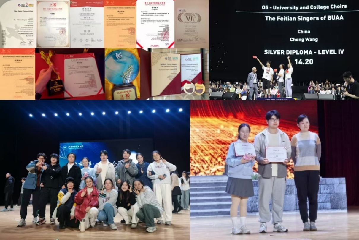 凭借深厚的艺术积淀与专业的指导支持,飞天艺术团在各类赛事中屡创佳绩:飞天合唱团先后斩获俄罗斯索契第九届世界合唱比赛高校组冠军赛金奖、韩国江陵第十二届世界合唱比赛银奖、第六届世界合唱比赛公开赛室内混声组银奖等国际大奖,多次在中国国际合唱节摘得金、银、铜奖,成为北航在国际合唱领域的一张“闪亮名片;飞天话剧团荣获北京市大学生艺术展演二等奖、首都高校大学生心理健康节心理情景剧展演一等奖等荣誉,原创剧目《九九八十一难》在学院七十周年院庆期间上演,以幽默叙事展现科研报国初心,引发师生强烈共鸣。