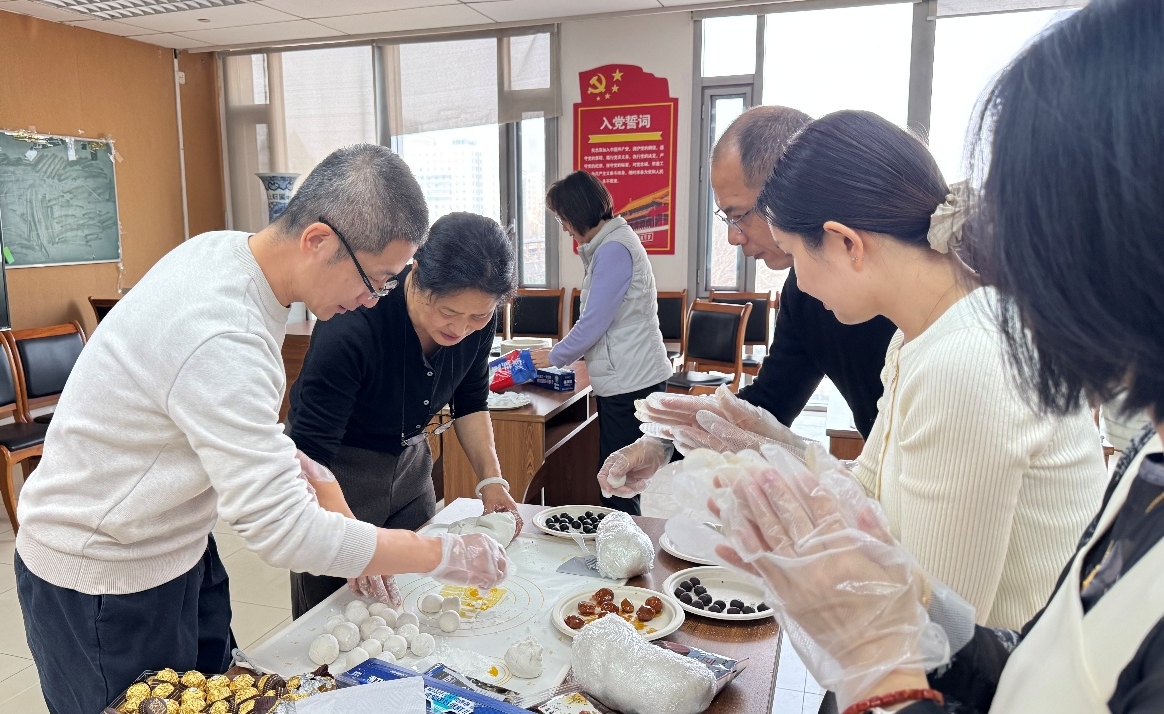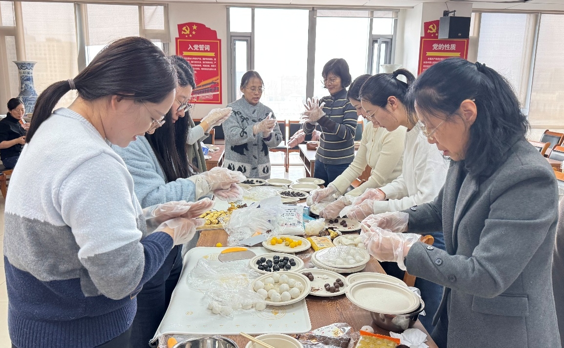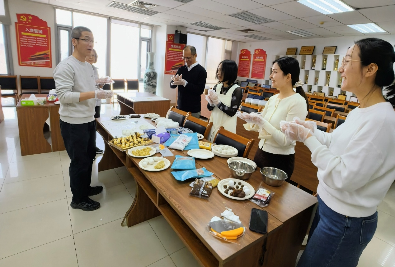 中午时分,活动正式拉开帷幕。郑征书记、王少萍老师、工会委员和老师们加入到包汤圆的队伍中。平日里在岗位上严谨认真的老师们,此刻纷纷化身“厨艺高手”。大家挽起衣袖,有的揉面,有的拌馅,有的搓圆,手法娴熟,配合默契,现场欢声笑语不断。